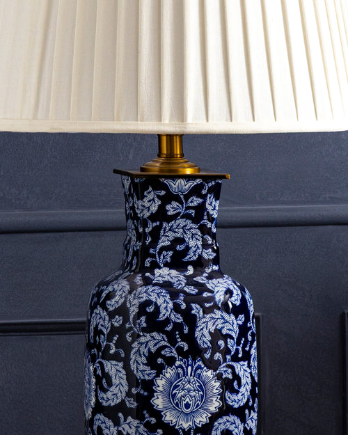 The Midnight Floral Ceramic Table Lamp features a deep navy base with elegant white floral patterns that add a classic decorative touch. Paired with a soft pleated ivory shade and brass mount, it creates a warm and stylish lighting accent perfect for living rooms, bedrooms, or side tables.