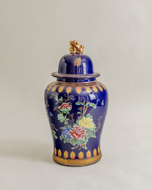 This temple jar exudes opulence and luxury, boasting a dramatic rounded shape with a wide lid and ornate top, giving the impression of regality. The deep blue color of the jar is stunningly complemented by the bold, vibrant, and colorful hand-painted peony blooms, adding depth to the overall design.