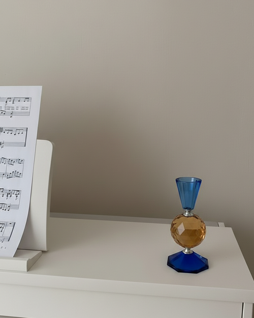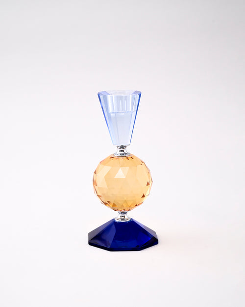 This elegant candle stand features a harmonious blend of geometric and spherical design. The faceted amber orb at its center radiates warmth and sophistication, while the blue crystal base and top add a cool, modern contrast.