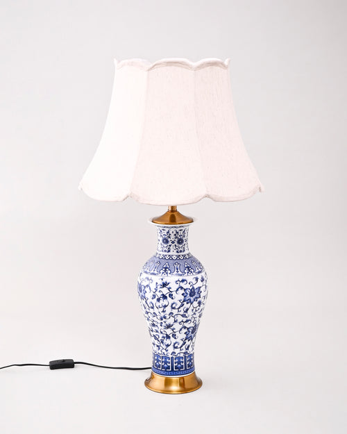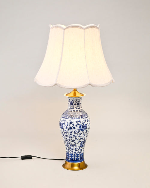 The Ming Blossom Blue & White Bone China Table Lamp is a classic piece of traditional craftsmanship, adorned with intricate lotus and floral patterns. Its elegant cobalt blue motifs on a pure white ceramic base symbolize peace, purity, and timeless beauty.