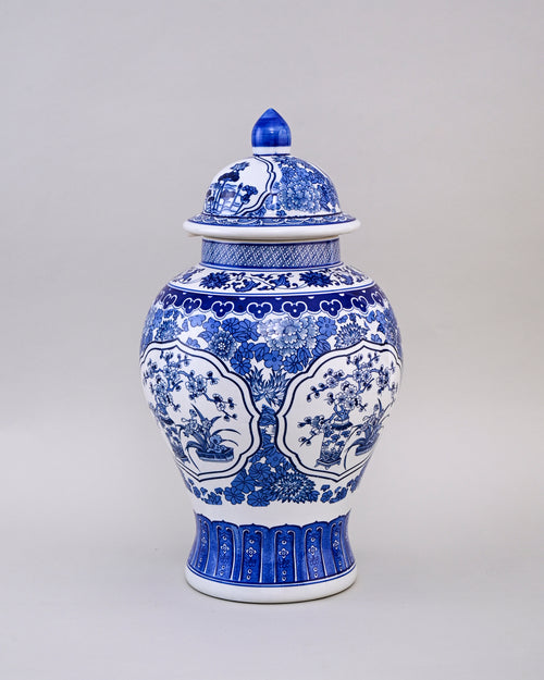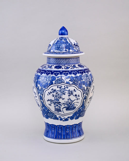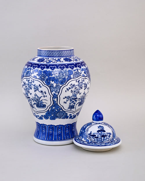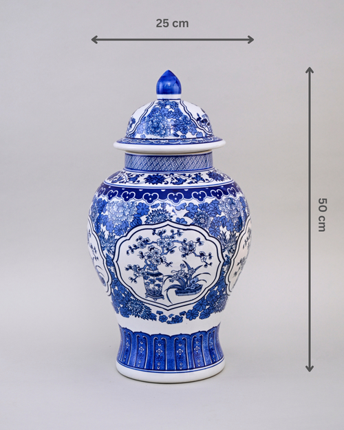 A classic blue-and-white ceramic temple jar adorned with blooming floral motifs, inspired by the elegance of the Ming Dynasty. Traditionally used as a symbol of prosperity and refined taste, it makes a graceful addition to any home décor.