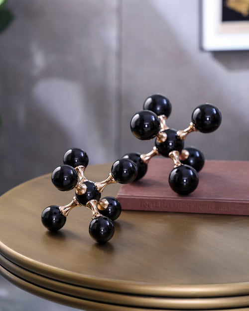 Add a contemporary flair to your space with this Modern Atom Molecular Tabletop Decor. Featuring a striking geometric design, this piece showcases glossy black spheres connected by metallic gold arms, evoking a mid-century modern aesthetic. Its bold structure makes it an eye-catching accent for coffee tables, shelves, or office desks. Ideal for those seeking a touch of artistic sophistication in their interior décor.