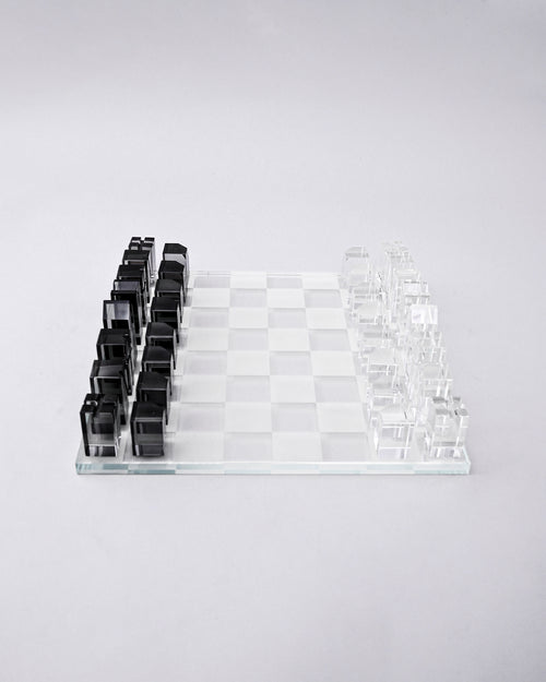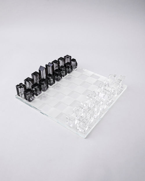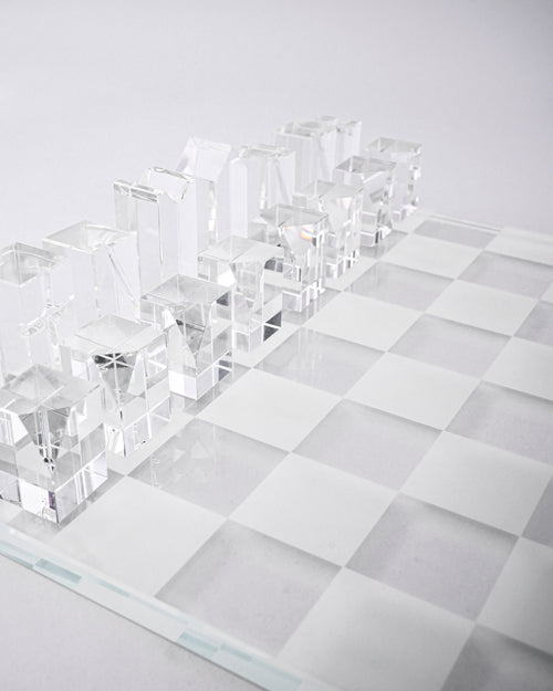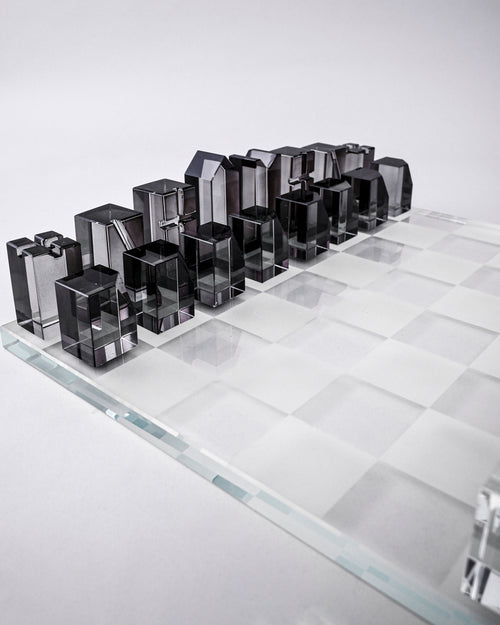A stunningly contemporary chess set featuring precision-cut geometric pieces crafted from white and smoky grey glass. The minimalist design transforms traditional chess into a work of modern art each piece shaped as sleek cones, cylinders, and prisms that reflect light beautifully on the clear glass board.