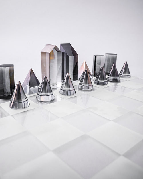 A stunningly contemporary chess set featuring precision-cut geometric pieces crafted from white and smoky grey glass. The minimalist design transforms traditional chess into a work of modern art each piece shaped as sleek cones, cylinders, and prisms that reflect light beautifully on the clear glass board.