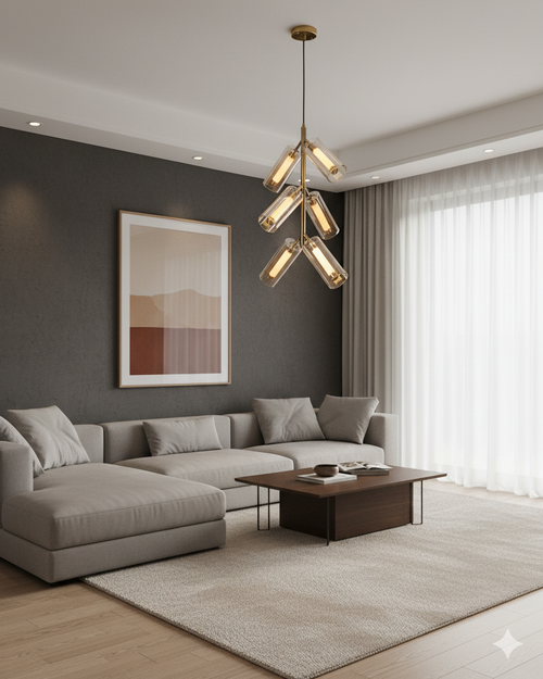 This is a contemporary pendant light featuring a vertical rod with multiple angled branches, each holding a cylindrical glass shade. The glass tubes are clear with warm-toned filament-style LED bulbs inside, giving a cozy golden glow. The design combines a minimalist metal frame with elegant glass shades, making it suitable for modern living rooms, dining areas, or bedrooms. Its artistic arrangement adds a sculptural element to the interior, blending functionality with stylish décor.