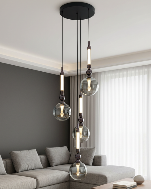 This pendant light features a stunning cluster design with multiple hanging globes combined with slim vertical LED rods. Each suspension showcases a balance of clear glass spheres and cylindrical light tubes, creating a luxurious modern aesthetic. The matte black ceiling plate and sleek suspension wires add a touch of minimalism, while the warm glow enhances the ambiance of living rooms, dining spaces, or entryways.