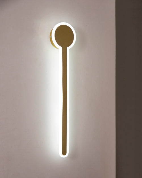 This is a sleek and modern wall light with a minimalist design. The fixture features a vertical structure with a circular top and an elongated stem. The main body has a matte gold finish, bordered by a white diffused LED strip that emits soft and uniform light. Its contemporary and clean aesthetic makes it perfect for modern interiors such as living rooms, hallways, or bedrooms. This light doubles as both an art piece and a functional fixture, ideal for spaces with a minimalist or Scandinavian design theme.
