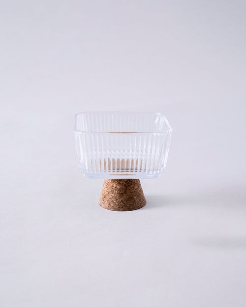 This Modern Ribbed Glass Dessert Bowl combines minimalist design with contemporary elegance. Featuring a square ribbed glass bowl perched on a natural cork cone base, it creates a perfect balance between texture and transparency.