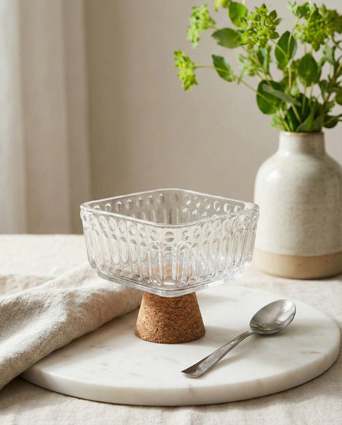 This Modern Ribbed Glass Dessert Bowl combines minimalist design with contemporary elegance. Featuring a square ribbed glass bowl perched on a natural cork cone base, it creates a perfect balance between texture and transparency.