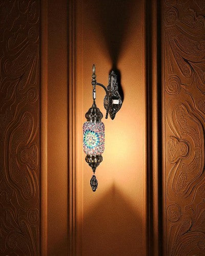 The Mosaic Glass Turkish Wall Light features vibrant, handcrafted glass pieces that create a warm, colorful glow. Its intricate design adds a unique artistic touch to any space. Perfect for enhancing your home with elegant Turkish flair.