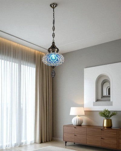 The Mosaic Glow Turkish Pendant Light brings vibrant colors and intricate patterns to your space, creating a warm, inviting atmosphere. Its handcrafted design adds a touch of exotic charm, perfect for living rooms or dining areas.