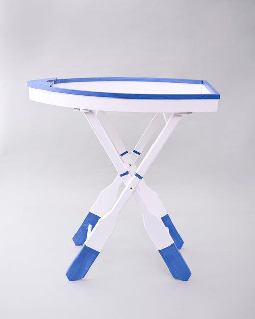 Bring a touch of coastal charm to your space with this beautifully crafted Nautical Accent Folding Side Table. Designed in the shape of a boat, this unique piece blends functionality with seaside aesthetics. The crisp white finish paired with striking blue accents adds a refreshing pop of color, perfect for coastal or contemporary interiors.