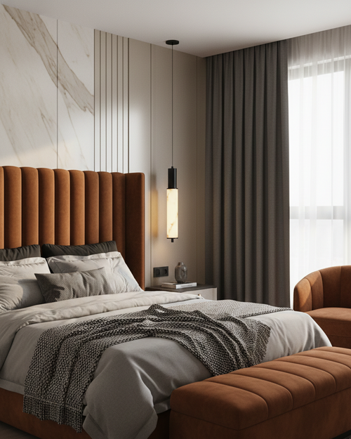 The Noirline Vein Pendant Light features a sleek marble-effect cylindrical shade paired with a matte black top and subtle metal detailing. Its soft vertical glow adds a refined contemporary touch to bedside settings, dining counters, and modern living spaces, creating a clean statement with quiet luxury.