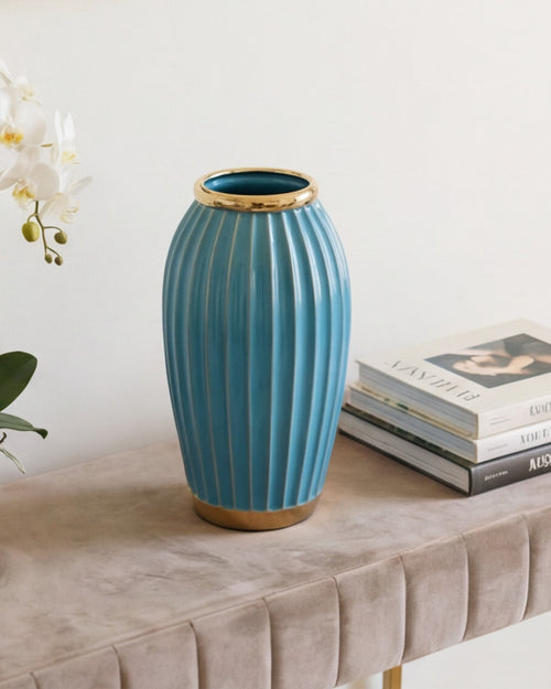 This ribbed vase is a beautiful piece of home decor that comes in a soothing blue color with gold accents. This vase is perfect for a center table, shelf, or entryway. It gives your space a sense of calmness and luxury.