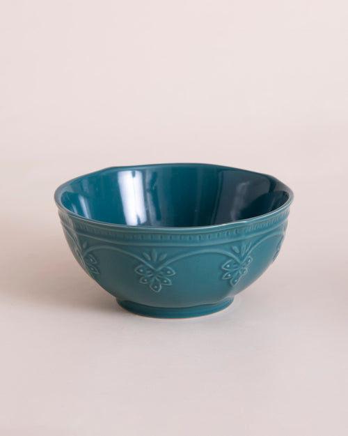 The Ocean Elegance Serving Bowl is a beautifully crafted ceramic bowl in a rich turquoise hue, reminiscent of tranquil ocean waters. Its scalloped edge is adorned with delicate, embossed floral and scroll patterns, giving it a timeless, vintage-inspired charm.