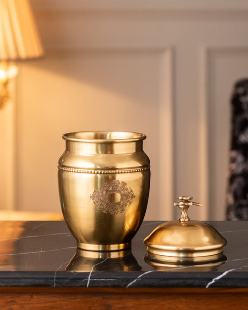 An easy way to make your space look classic, this handcrafted brass jar is gilded in a rich finish. The classic silhouette and a hand-etched emblem give it the heirloom quality of a found piece, it can be simply displayed as an object d'art or paired with other similar jars of varying height.