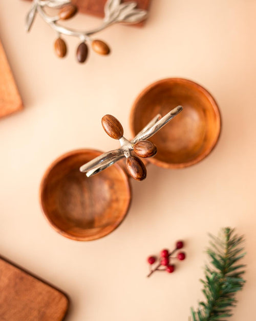 Crafted of wood with two niches and a brown finish this handy serving dish presents dips sauces veggies and nut medleys in high style.