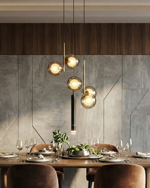 The Orbelyn Cluster Pendant Light features multiple smoked-glass orbs suspended at varied heights with sleek brass accents and a central black stem. This layered composition creates a dramatic, floating glow perfect for stairwells, dining areas, and contemporary luxury interiors.