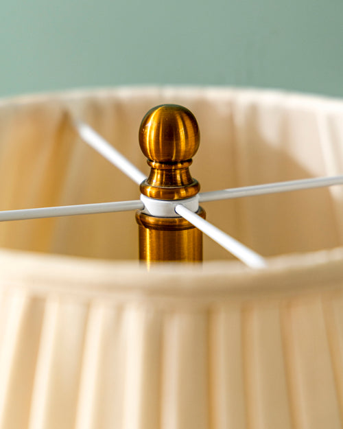 Finished with refined brass accents and paired with a pleated fabric shade, the lamp emits a warm, ambient glow while serving as a striking décor statement. Ideal for living rooms, bedrooms, or entryway corners, it effortlessly complements both classic and contemporary interiors.