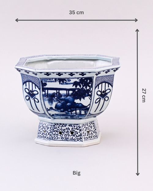 These elegant octagonal ceramic planters are beautifully designed with intricate blue and white oriental patterns inspired by traditional Chinese art. The scenic landscape motifs add a touch of heritage and sophistication, making them perfect for both indoor and outdoor decoration.