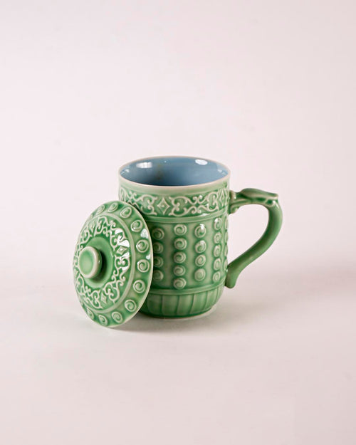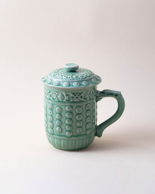 This Oriental Harmony Mug is the perfect addition to your morning routine. With its sleek design and included lid, your beverage stays hot and secure. Crafted from quality materials, this mug provides a classic and timeless look. Enjoy your coffee or tea in style with this elegant and functional mug.