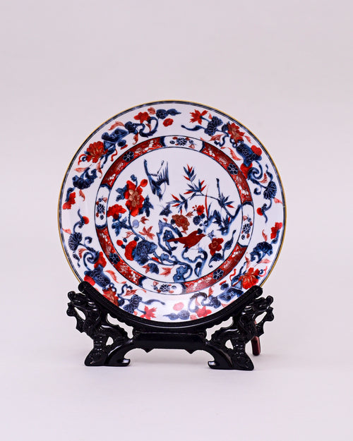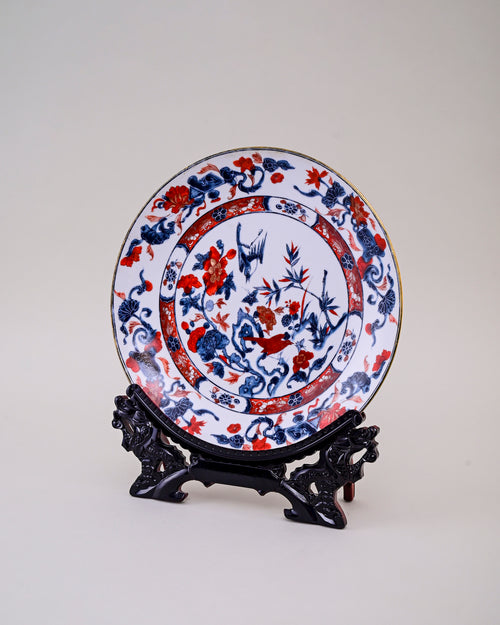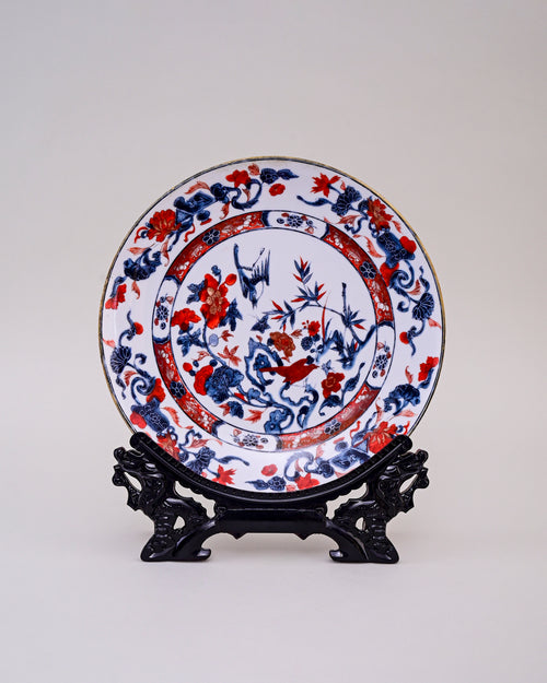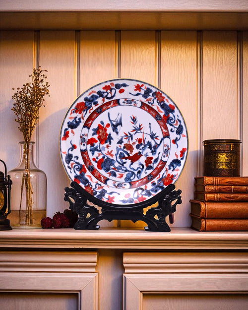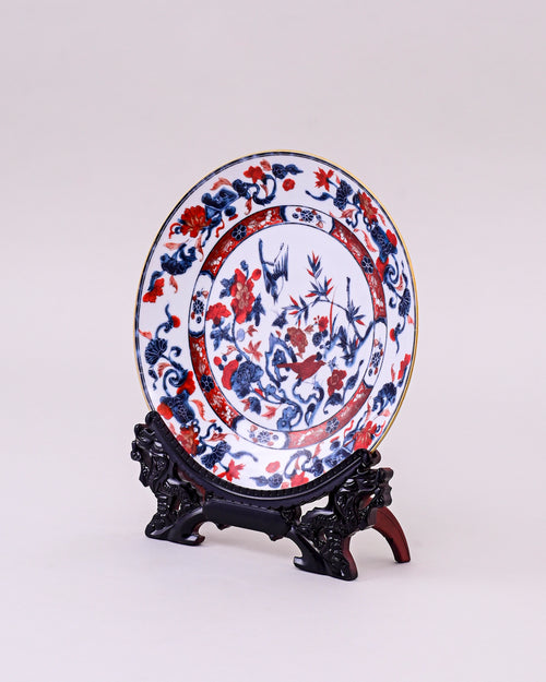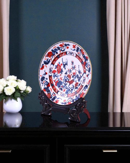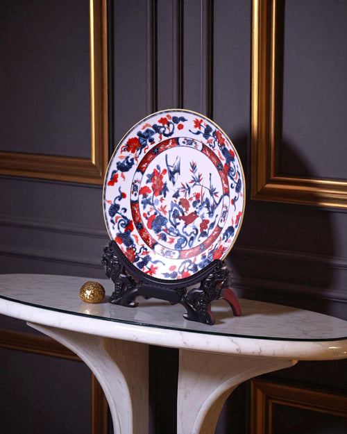 This striking porcelain plate is designed in the classic Imari style, blending vivid cobalt blue and vibrant red with delicate golden accents. The central scene depicts a traditional garden with symbolic motifs, framed by floral and geometric patterns along the border.
