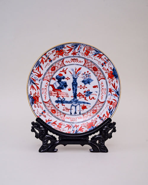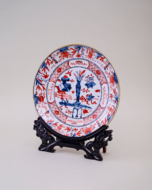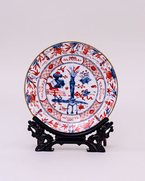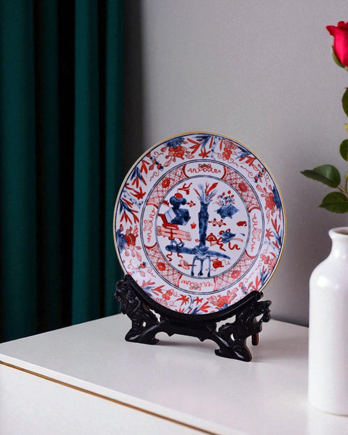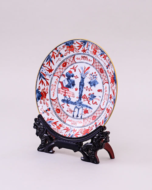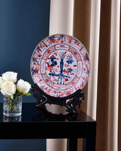This striking porcelain plate is designed in the classic Imari style, blending vivid cobalt blue and vibrant red with delicate golden accents. The central scene depicts a traditional garden with symbolic motifs, framed by floral and geometric patterns along the border.