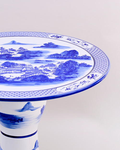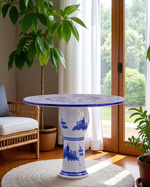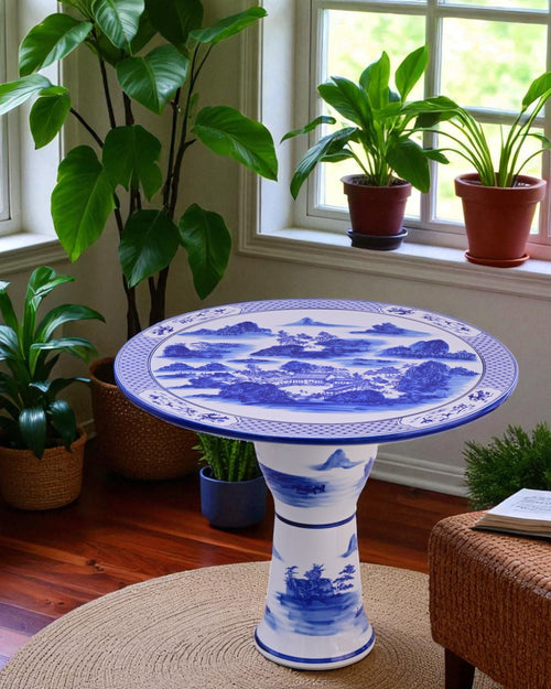 This exquisite porcelain center table showcases a mesmerizing hand-painted blue landscape scene, inspired by traditional oriental artistry. The round tabletop rests on a gracefully flared pedestal, creating a perfect balance of elegance and durability.
