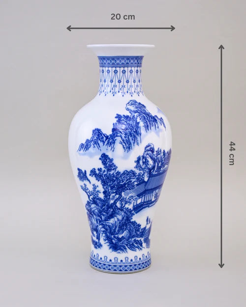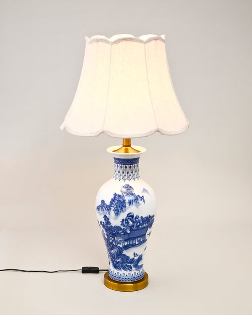 The Oriental Mountain & Pavilion Bone China Table Lamp beautifully captures the essence of traditional Chinese art, featuring hand-painted mountains, trees, and a serene pavilion scene in classic cobalt blue. Crafted from fine ceramic with a glossy white finish, this vase reflects peace, harmony, and cultural heritage.
