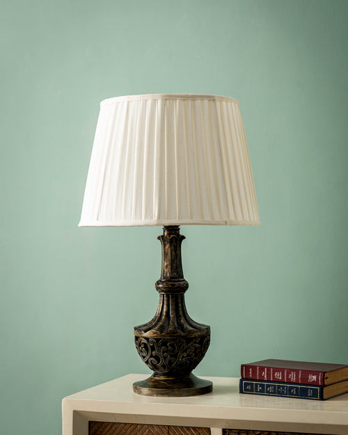 Ornate Crown Table Lamp features a beautifully engraved antique-finish metal base with a soft pleated fabric shade. Its royal design adds timeless elegance to bedrooms, living rooms, and premium interior spaces while creating warm, soothing light.