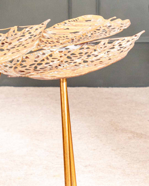 The Palm Leaf Gold Side Table lends a luxurious touch to any space. This side table features a unique palm leaf design that adds elegance to the piece. Its golden finish gives it an effortless sophistication.