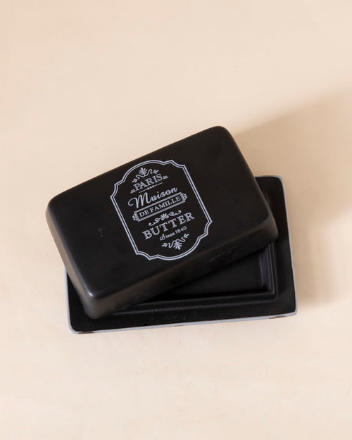 This butter dish is made from quality ceramic with a white glaze and distressed finish and features black text reading 'Paris Maison De Famille'.