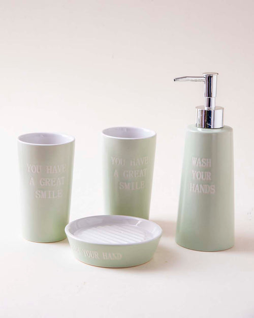 The set of 4 includes a soap dispenser, toothbrush holder, tumbler, and a soap dish.