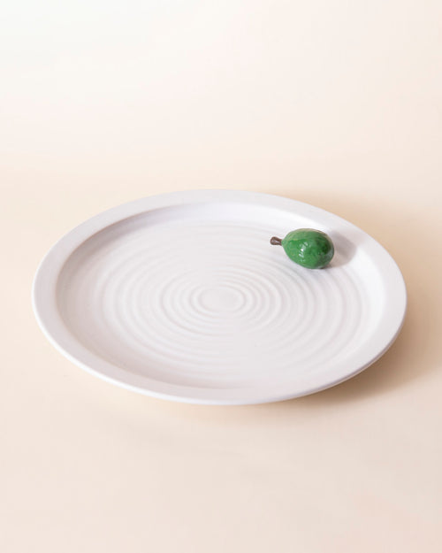This is a beautifully designed ceramic platter featuring a clean, white finish with a subtle spiral texture on its surface. The minimalist design is enhanced by a small, handcrafted pear accent on the edge, adding a touch of uniqueness and charm. The combination of simplicity and artistic detail makes this platter ideal for serving food, displaying desserts, or as a decorative piece in a modern or rustic setting.
