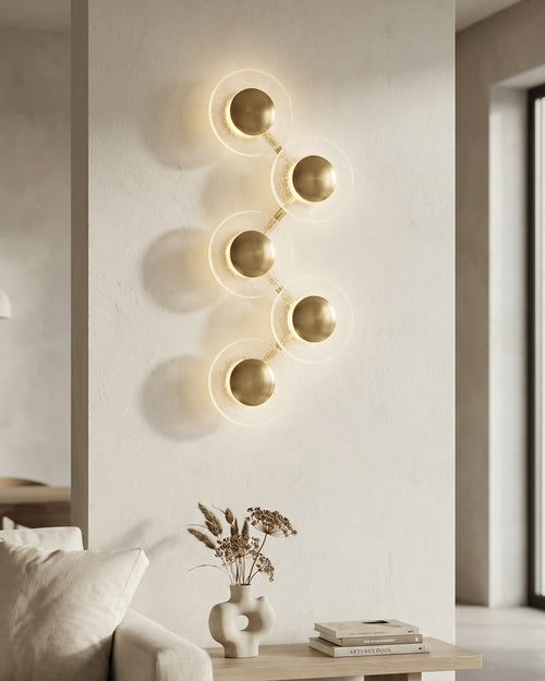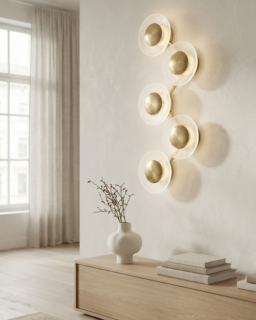 The Pentora Lume Cascade Wall Light features five softly textured circular diffusers with brushed gold centers, arranged in a flowing vertical composition. This cascading design creates a luminous art installation on your wall while delivering warm ambient light—perfect for stairways, double-height walls, and luxury interiors.