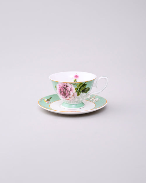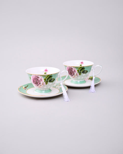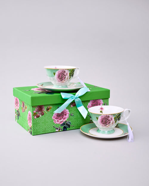 Peony Petals Tea Cup & Saucer Green - Set Of 2