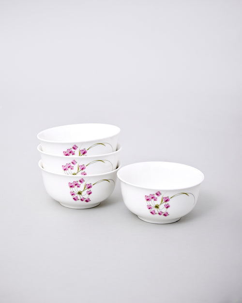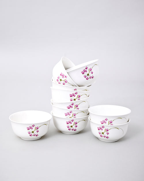 This charming porcelain katori is beautifully designed with delicate pink floral patterns on a pure white base, giving it a graceful and fresh look. The glossy finish enhances its elegance, making it perfect for both everyday meals and festive occasions.