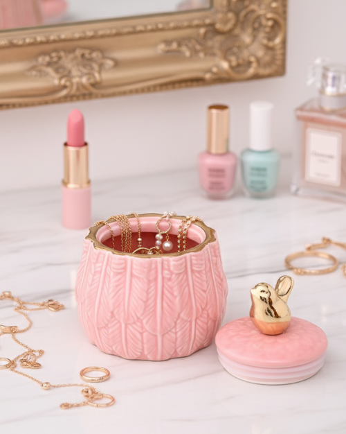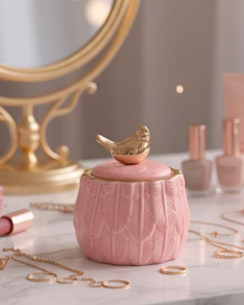 A charming decorative jar featuring a delicate feather-textured design in soft blush pink, crowned with a golden bird accent on the lid. Perfect for storing trinkets, jewelry, or simply enhancing your space with a touch of botanical elegance and luxury.