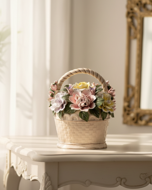 Made from high-quality materials, this decorative piece features a charming arrangement of lifelike artificial flowers nestled in a classic Porcelain basket. Perfect for enhancing the beauty of your living room, bedroom, office, or even gifting on special occasions.