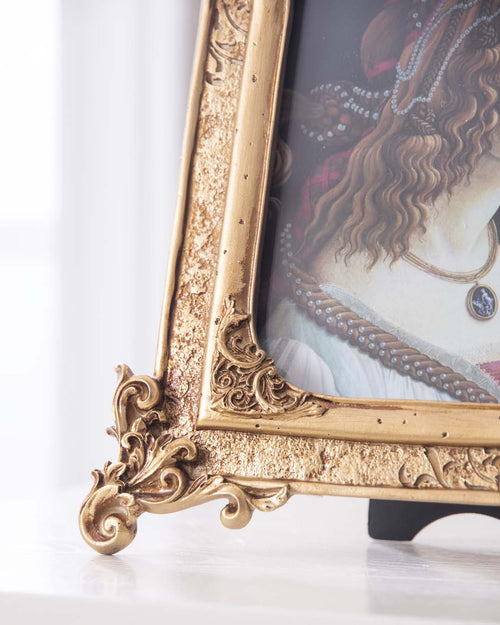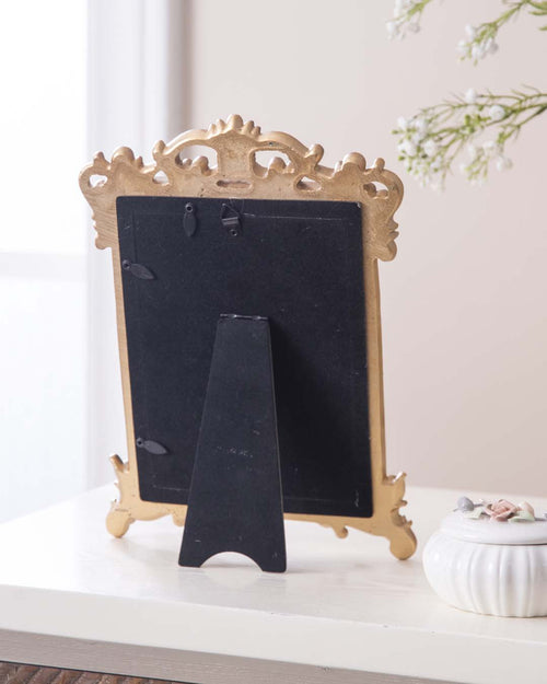This classic Victorian themed photo frame features a charming distressed gold finish along with a gold-tone picture border - a mesmerizing colour combination! Bringing in a touch of regal elegance, this majestic frame extends on each side ornate, Victorian-style carvings - making the frame perfect to add the regal touch to your memories and your home. The design blends classic palette with modern functionality for an enduring appeal and will look mesmerizing along with other accents in a clutter.