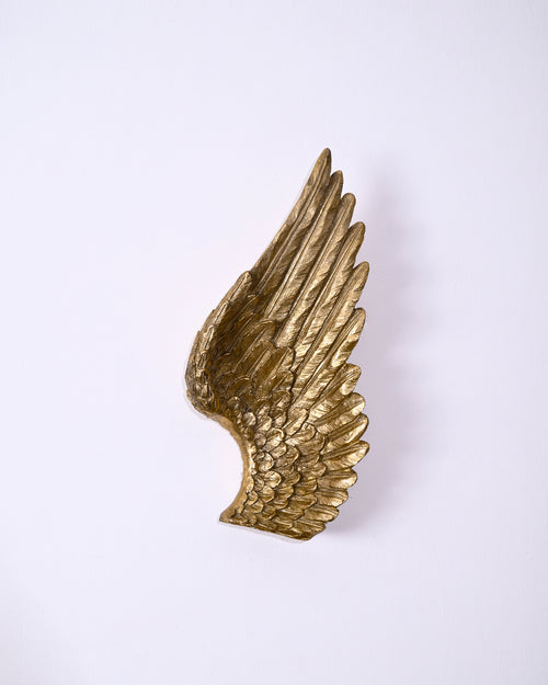 A stunning golden wall accent featuring intricately detailed angel wings that symbolize freedom, hope, and protection. Crafted with a metallic finish, this piece adds a touch of luxury and serenity to your living space, making it a perfect statement decor for any wall.