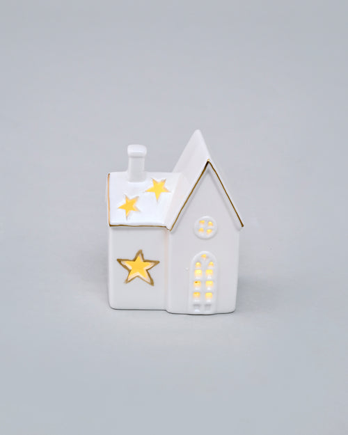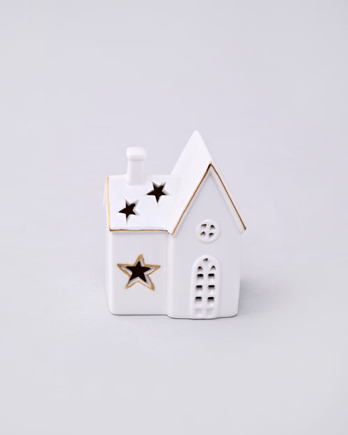 Add a soft, magical glow to your space with this Starry White House Tealight Holder. Crafted with charming cut-out stars and elegant gold detailing, this miniature ceramic house beautifully diffuses candlelight, creating a warm and cozy atmosphere.
