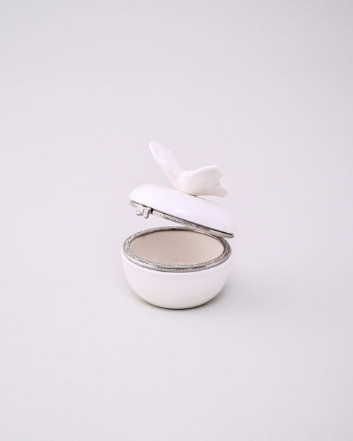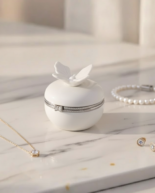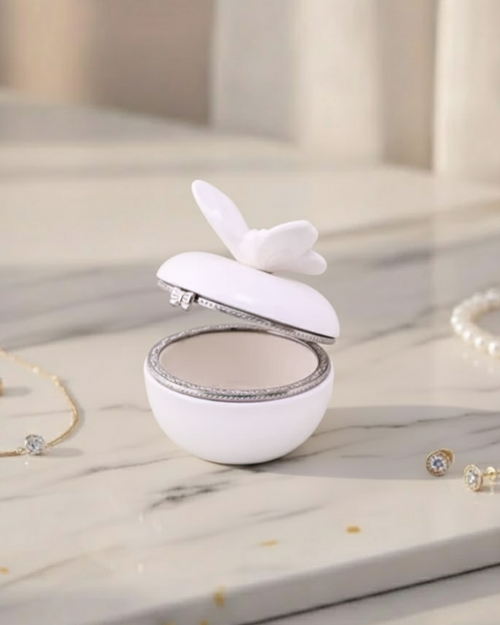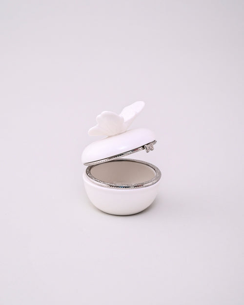Delicate and dreamy, this Butterfly Embrace Trinket Box is a symbol of grace and transformation. Its smooth, rounded silhouette paired with a dainty butterfly perched on top creates a serene and timeless design. The silver metal clasp adds a subtle vintage charm, making it an elegant piece for your dresser or vanity.