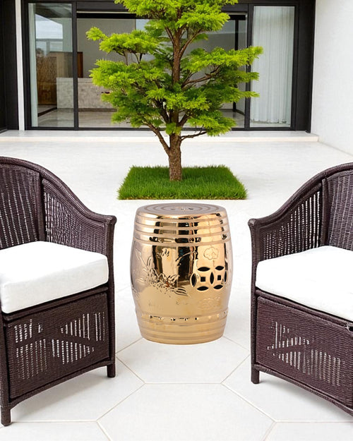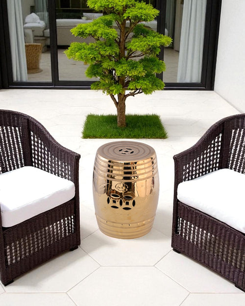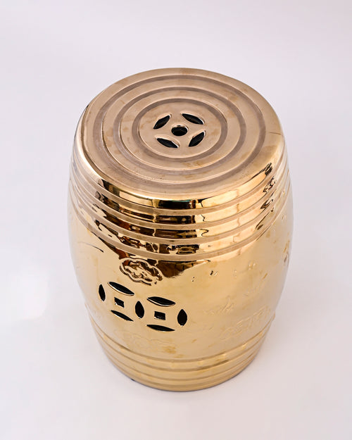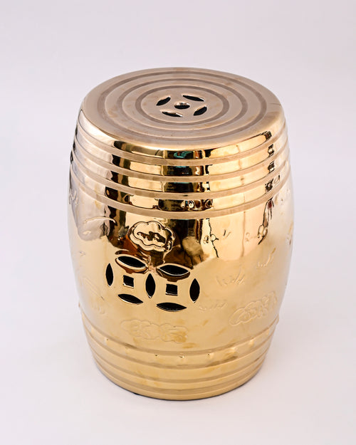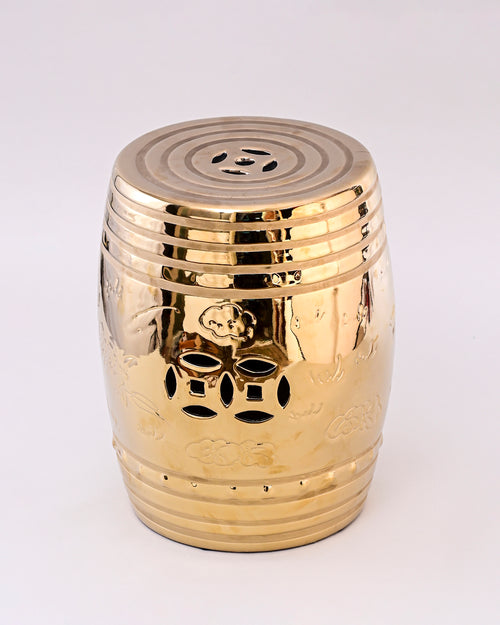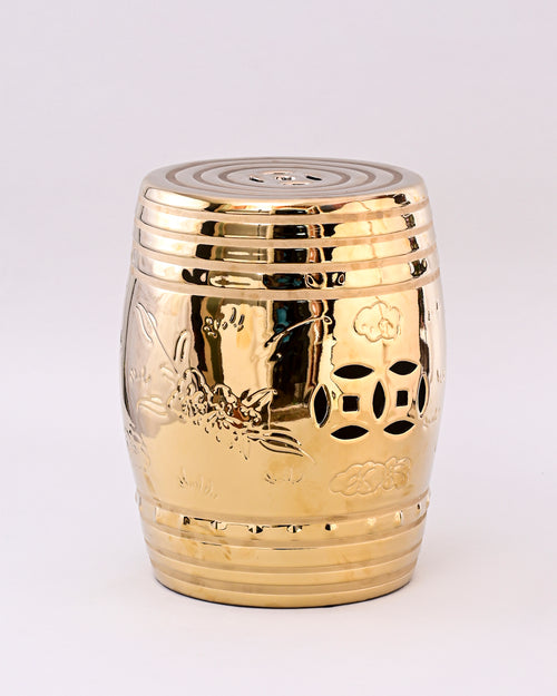 This luxurious garden stool features a radiant golden finish with a sleek, glossy surface that reflects light beautifully. Its barrel-shaped body is adorned with subtle engraved floral motifs and traditional cutout patterns, adding both elegance and functionality. The concentric ring design on the top enhances its modern appeal while retaining a touch of classic charm.