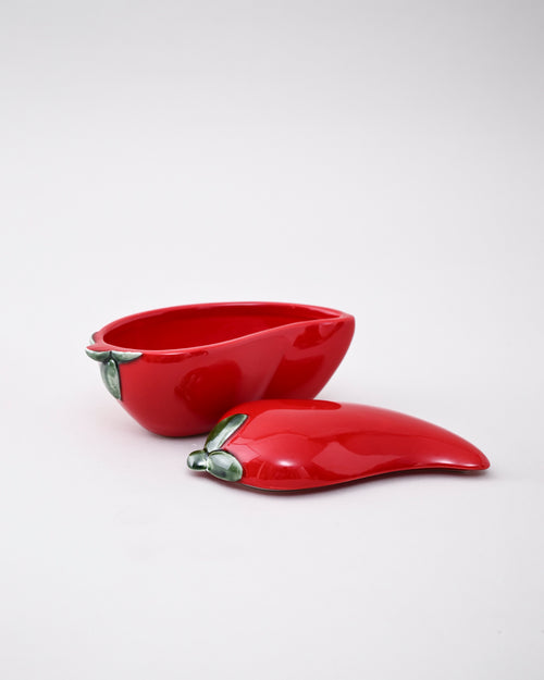 Add a fun and vibrant touch to your kitchen with this Red Bell Pepper Ceramic Bowl with Lid. Designed in the realistic shape of a red capsicum, this charming piece combines functionality with creativity. The glossy red glaze and green stem detailing make it a standout accent for serving or storage. Perfect for keeping snacks, candies, or condiments, it also doubles as a decorative piece for your dining table or kitchen shelf. Its unique vegetable-inspired design brings freshness and color to any space a delightful blend of art and utility.