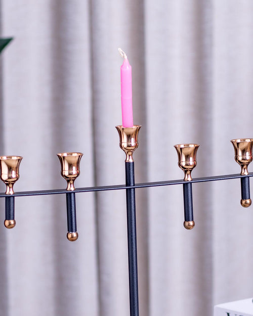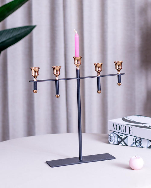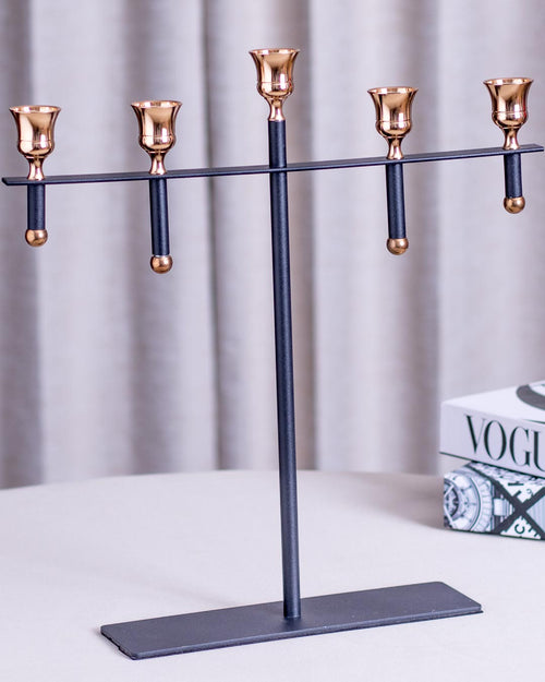 Elevate the ambiance of any room with our sleek and stylish candle stand. Crafted from high-quality metal, this black-colored stand features gold-colored finish holders, adding a touch of elegance to your home decor.