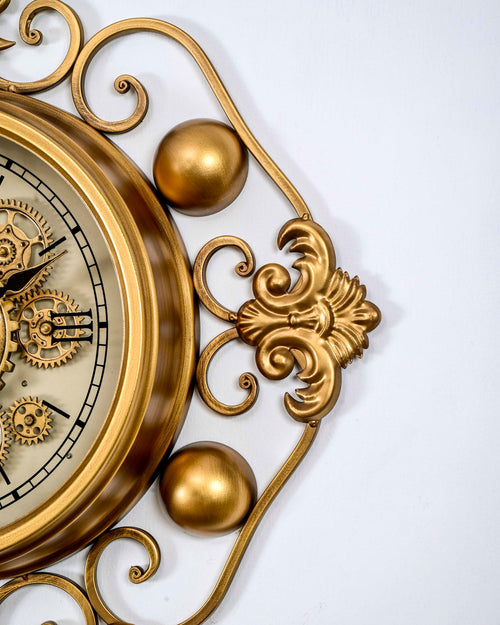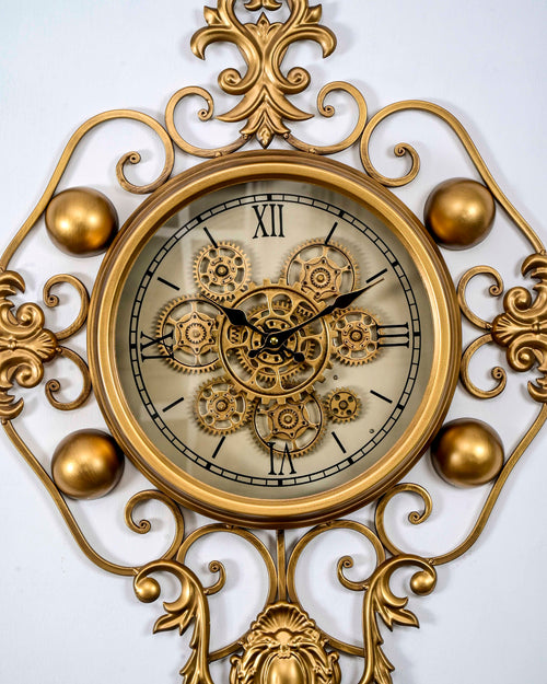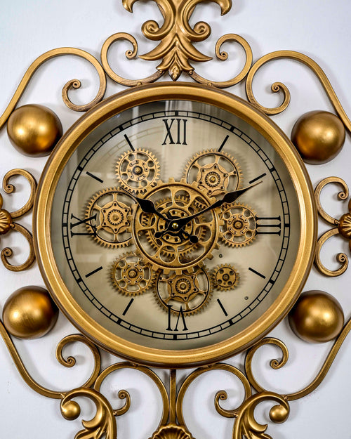 This luxurious wall clock is a stunning blend of art and function, designed with intricate vintage-style carvings and a radiant antique gold finish. The central clock face features Roman numerals and elegant floral gear motifs, surrounded by a highly detailed frame of scrolls, leaf accents, and symmetrical baroque patterns. Ideal for classic interiors, royal-themed rooms, or elegant hallway decor, this timepiece adds timeless charm and sophistication to any wall.