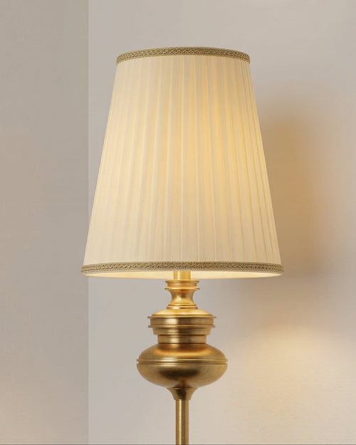 The Regent Vellum Floor Lamp features a tall brushed-brass stem crowned with a softly pleated fabric shade that casts a warm, inviting glow. Its slender, elegant profile fits beautifully beside sofas, reading chairs, and lounge corners, adding timeless sophistication with gentle ambient light.