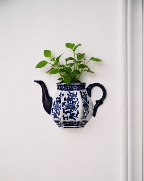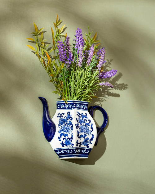 Painted in a traditional blue and white palette, this wall mounted kettle comes with a flat back and creates visual drama for your walls. Use this as a standalone wall accent or place your favorite flowers to create your own unique wall accent.