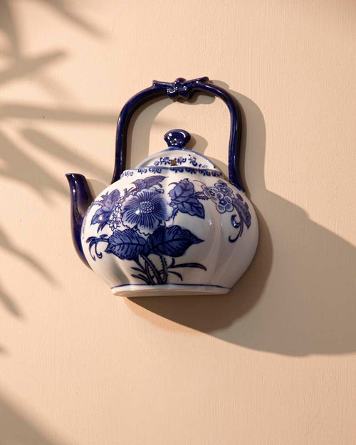 Painted in a traditional blue and white palette, this wall mounted kettle comes with a flat back and creates visual drama for your walls. Use this as a standalone wall accent or place your favorite flowers to create your own unique wall accent.